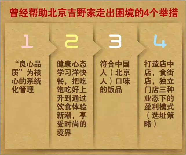 1996年吉野家面临亏损时请来赵申,他通过上述这4条举措成就了当时的吉野家,其他城市纷纷前来学习。时隔5年,赵申又用同样一套方法指导创建了和合谷,依然成功将品牌推到了人们眼前,在行业里站住了脚跟。