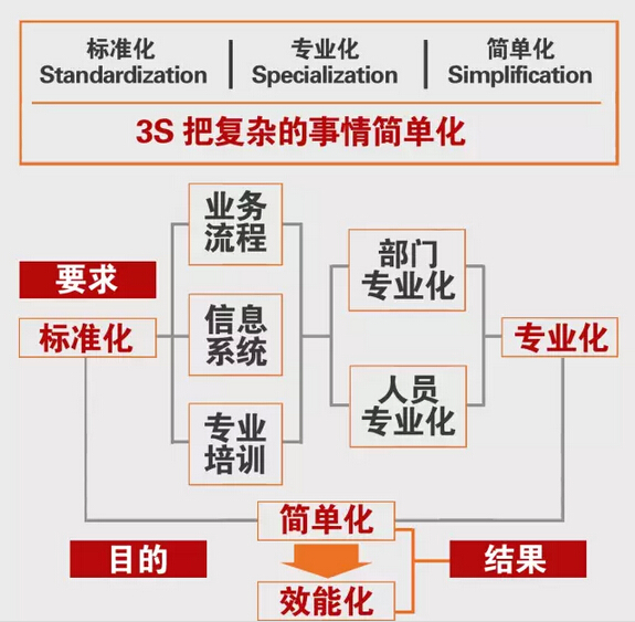 同时,赵申提出做系统化管理,标准化、简单化非常重要。比如麦当劳在连锁经营管理上有一个被称为“3S”的理论标准。把业务专业化,然后来做标准,标准化后再形成简单化后的标准。简单化后达到效能化,就是和合谷系统化管理的目标,也是连锁经营的本质。
