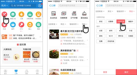 为了让消费者更快找到参与立减的商家,支付宝口碑频道特地上线了商店筛选功能。用户选择买单立减功能,口碑系统会根据用户所在的地理位置,推荐具有此项优惠的线下商家。
