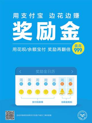 今年3月起,支付宝用户每天在贴有奖励金海报的支付宝商家处,首次消费超过2元,就能获得1笔奖励金。使用支付宝花呗、余额宝支付,获得的奖励金有一次翻倍机会,翻倍后最高可获得999元。周日到周四累积的金额,周五周六消费时直接抵扣。除此之外,每周二使用花呗、余额宝在线下买单,还能获得8折(5元封顶)的优惠。